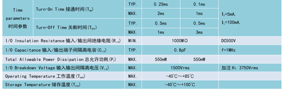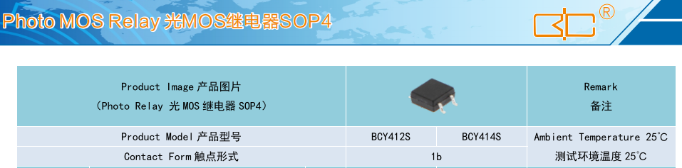 (Relay 光 MOS 繼電器 SOP4),Product Model產品型號:BCY412S、BCY414S,Contact Form 觸點形式:1b,Ambient Temperature 25°C,測試環境溫度 25℃
