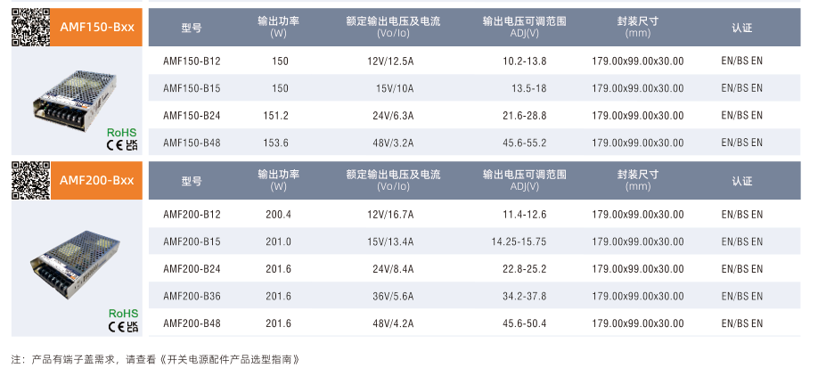 AMF75/100/150/200-Bxx, ·輸入電壓范圍:85-305VAC/120-430VDC ·交直流兩用(同一端子輸入電壓) ·工作溫度范圍:-30°Cto +70℃ ·主動式 PFC ·4000VAC高隔離電壓 ·高效率,高可靠性 ·輸出短路、過流、過壓、過溫保護(過流恒流限制) ·EMI滿足 CISPR32/EN55032 CLASS B